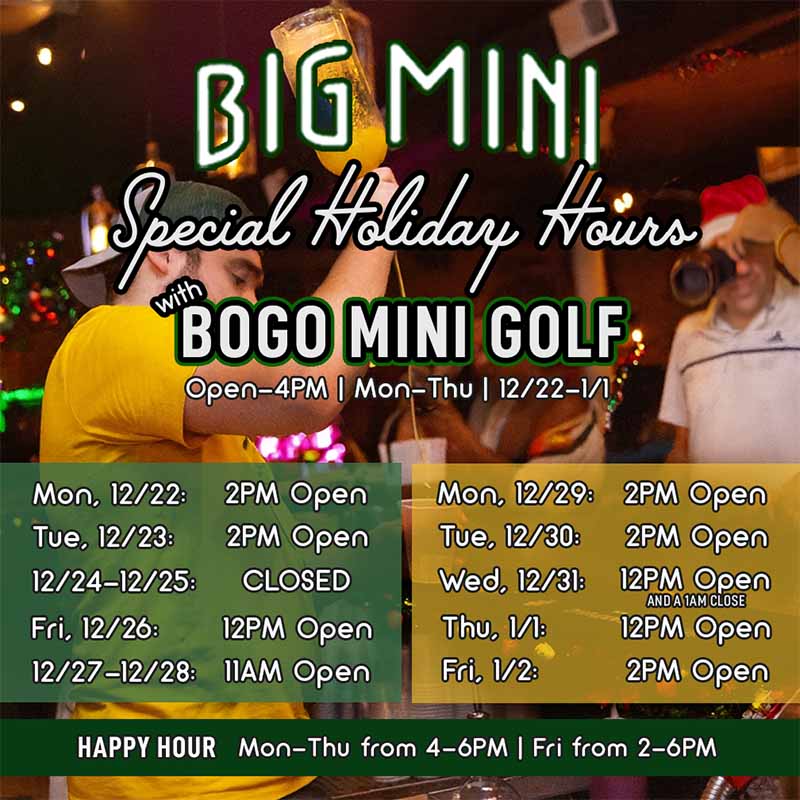 PLUS: Buy One, Get One Free (BOGO) rounds of Mini Golf Mon-Thu from 12/22-1/1 (select hours).