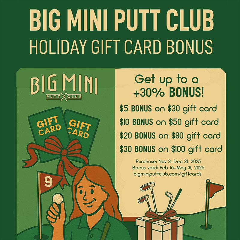 Receive up to a +30% BONUS on BIG MINI PUTT CLUB gift cards purchased between Nov 3 and Dec 31, 2025.
